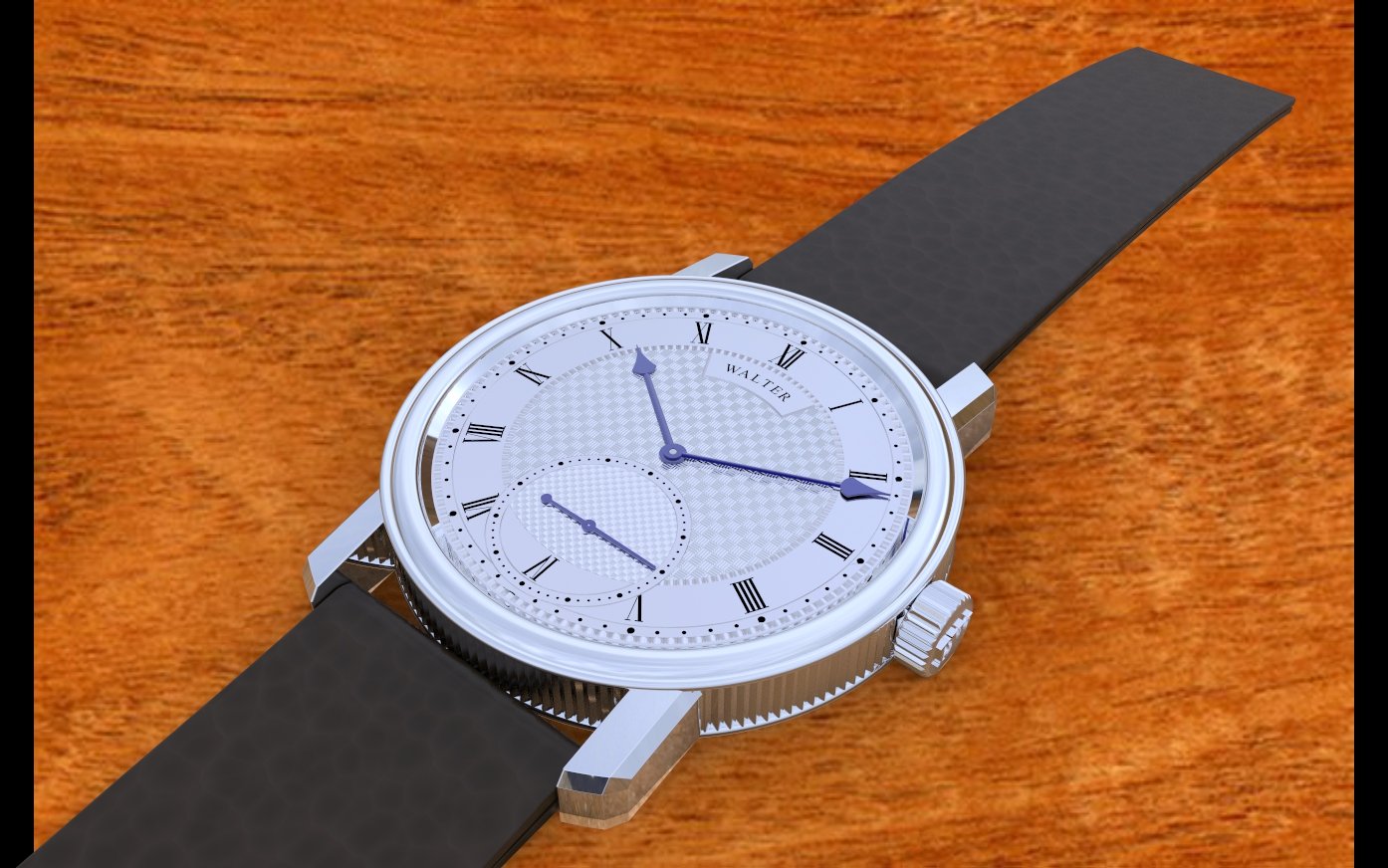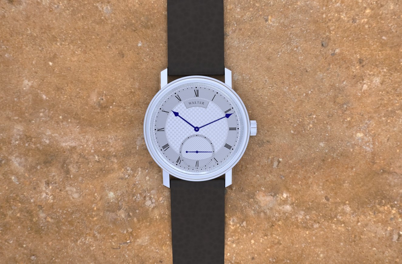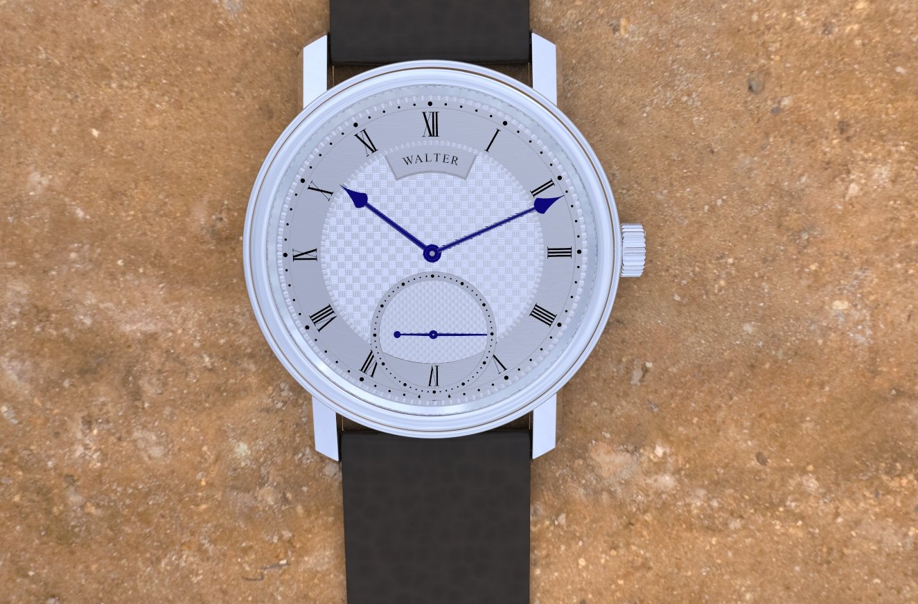 The silver engine turned dial shows two different patterns and the seconds hand reveals a unique layout. Notice the subtle, yet unusual toothing on the dial ring. As part of the motif, the watch uses the fire blued Walter-style hands, a characteristic of the Walter horological