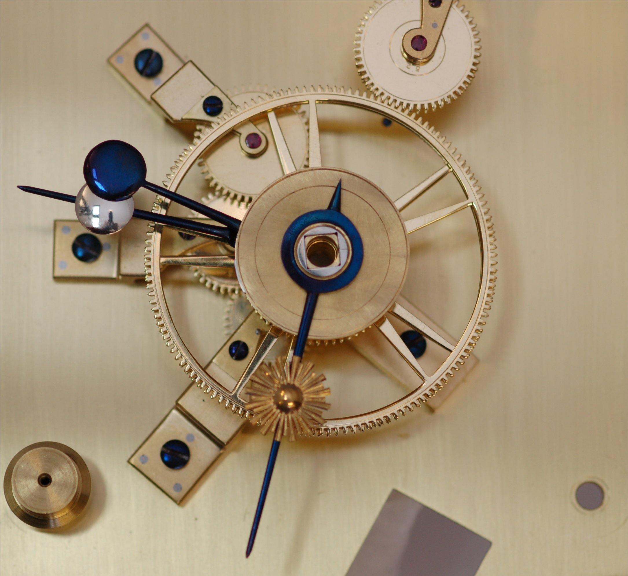 This particular mechanism permits the Sun wheel to rotate the Sun hand once per Civil month while the Lunar display moves at a different rate. One full rotation is approximately 29 1/2 days.