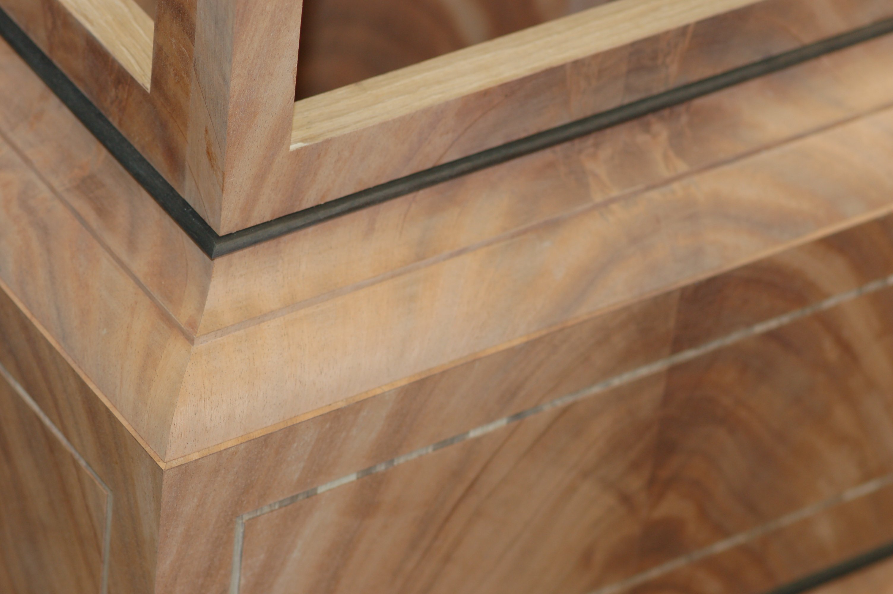 You will notice the upper and lower convex and concave moldings have been veneered in Flame mahogany so the pattern is continuous, this is no easy task to veneer curved shapes.