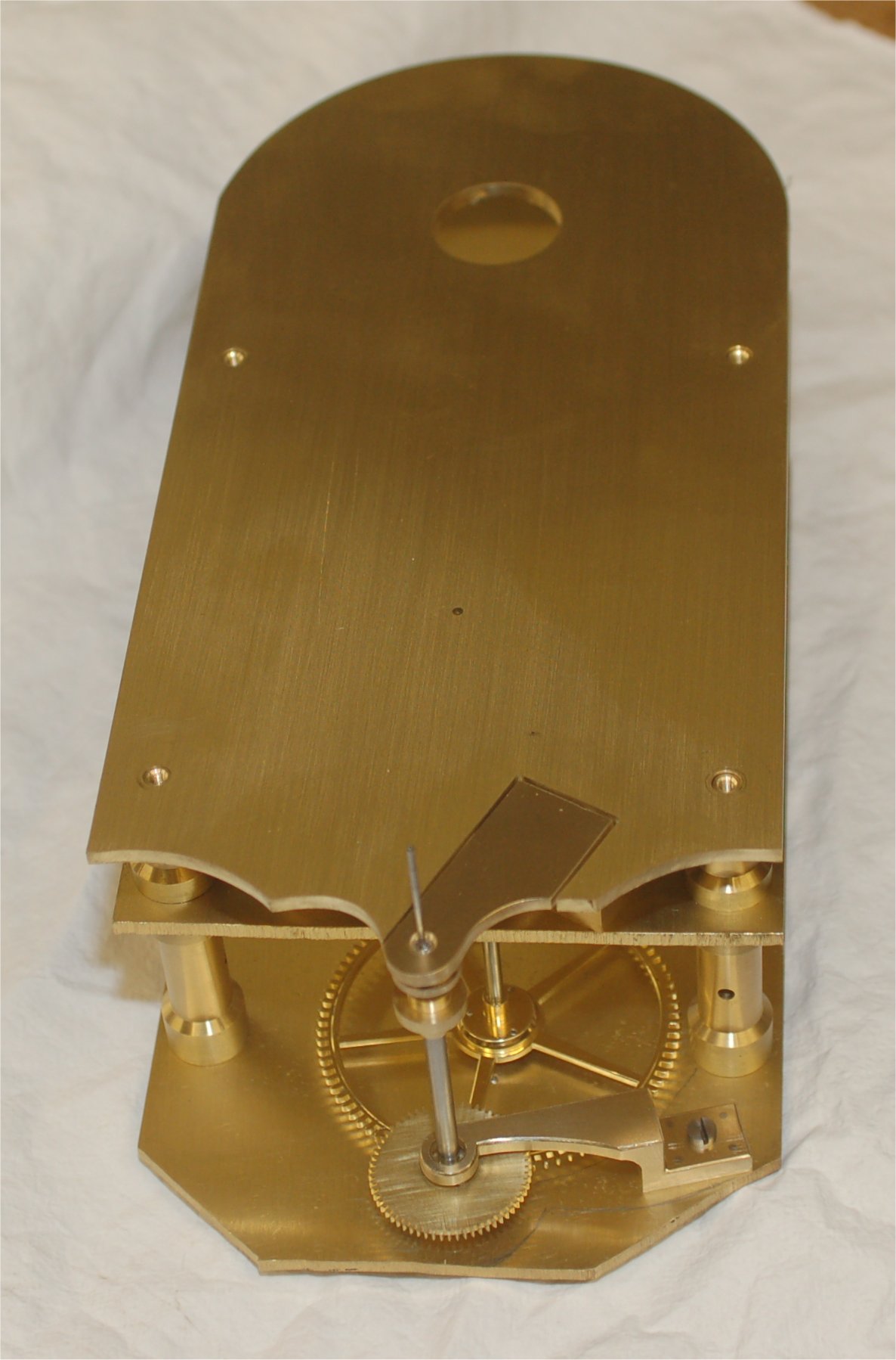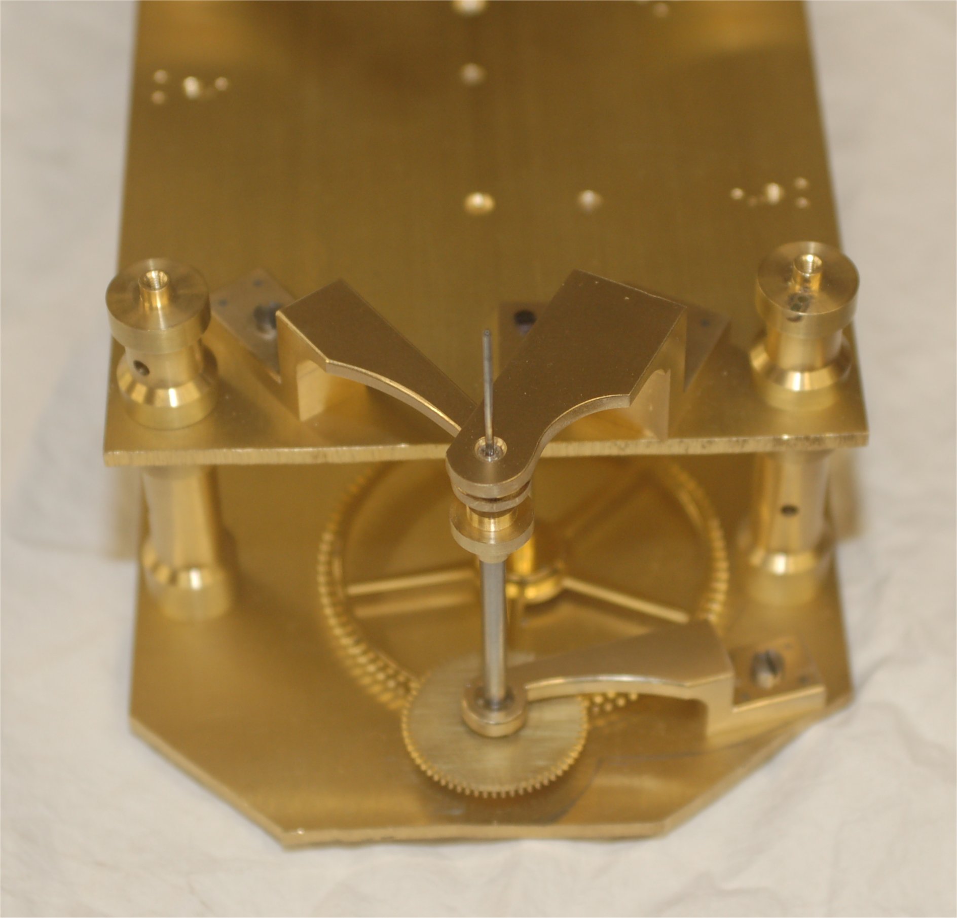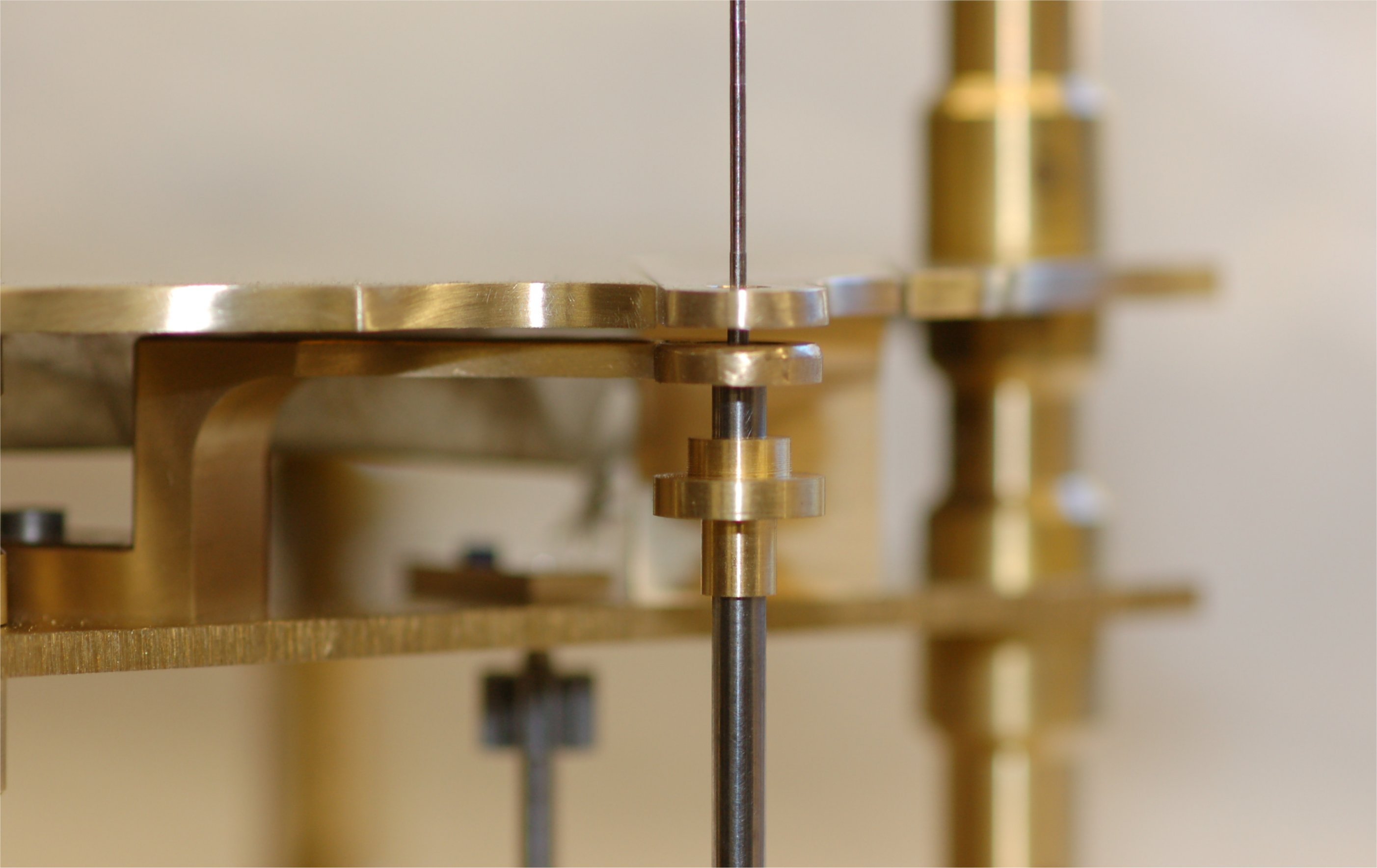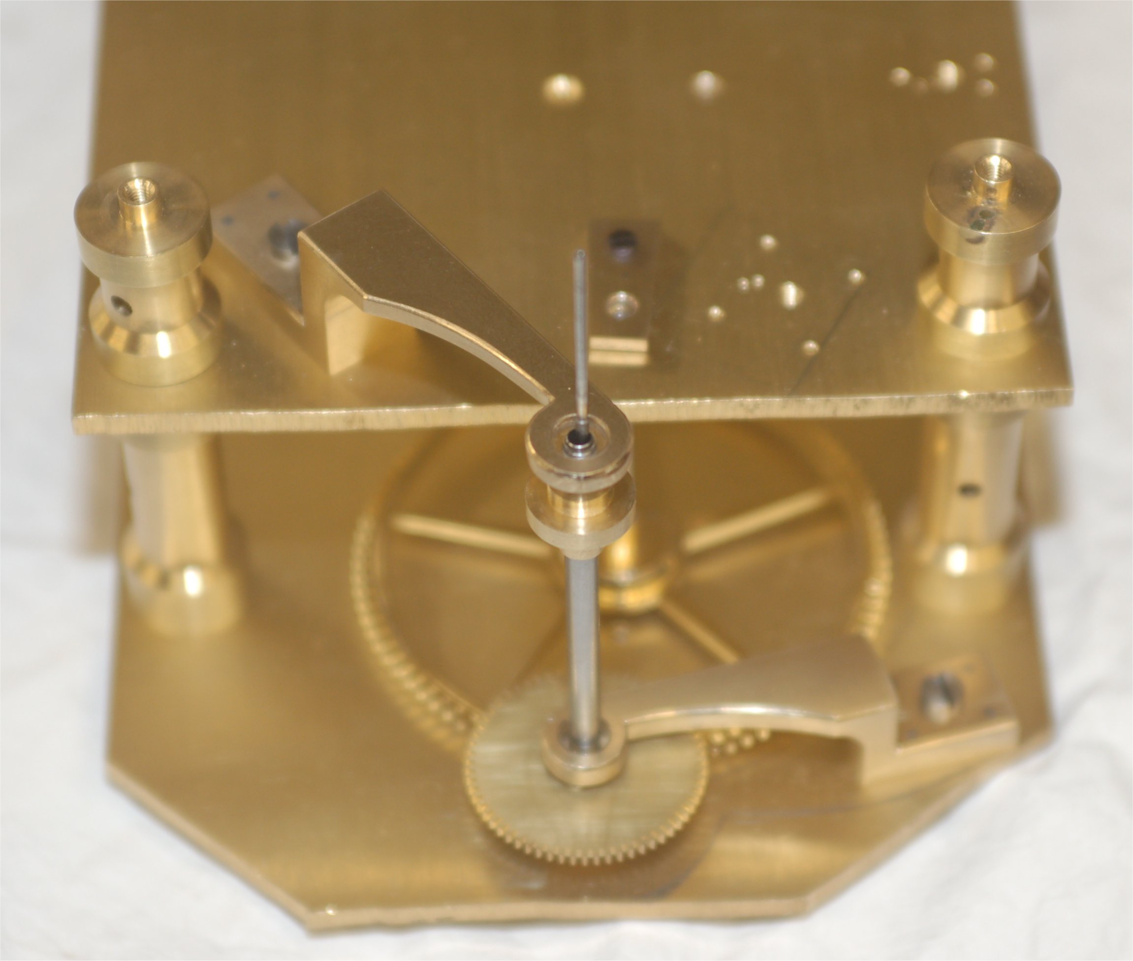 As you know I prefer the ability to remove the calendar plate, or in this case the Wandering Moon plate and its mechanism, without interfering with the running of the clock. The escape wheel which is independent and Co-Axial with the seconds arbor and rotating at different rates on the Sidereal movement must be all the way forward to intersect with the pallets, in previous versions of this clock I was able to use the front plate to support both arbors. However as this Sidereal movement will have the addition of the Wandering Moon complication and a Sidereal Time/Civil Time conversion train to drive the Wandering Moon this movement now has 3 plates. Naturally I want to be able to remove the 3rd plate with the Lunar mechanism from the movement and not interfere with the running of the clock. To achieve this and to have the escape wheel forward where it needs to be I have designed and fitted 2 separate cocks, one for the escape wheel front pivot, the other for the seconds front pivot. I made the seconds cock the same height as the inner face of the 3rd plate then cut the plate to accept the seconds cock and simultaneously profiled the outer portion of the cock to match the serpentine shape of the plates. Descriptions; Co-Axial escape arbors1; Top view of the 3 plates, the upper 3rd plate will be home to the Wandering Moon and the Sidereal/Civil time conversion train. The 3rd wheel is shown driving the seconds arbor which is under the uncrossed 1st wheel in the sidereal conversion train. The shaft with the brass collet is for the escape wheel. Co-Axial escape arbors 2; The 3rd plate has been removed to show the two cocks supporting the escape wheel/seconds arbor. Co-Axial escape arbors 2a; A side view of two cocks with the top plate fitted, the gap between the cock and the top plate is visible each side of the upper cock, I have also made the cock 0.2mm lower than the upper for safety clearance with any part of the . Co-Axial escape arbors 3; The upper cock for the seconds arbor has been removed showing the seconds shaft passing through the hollow escape wheel arbor. This arrangement is very rare to find in a clock. David