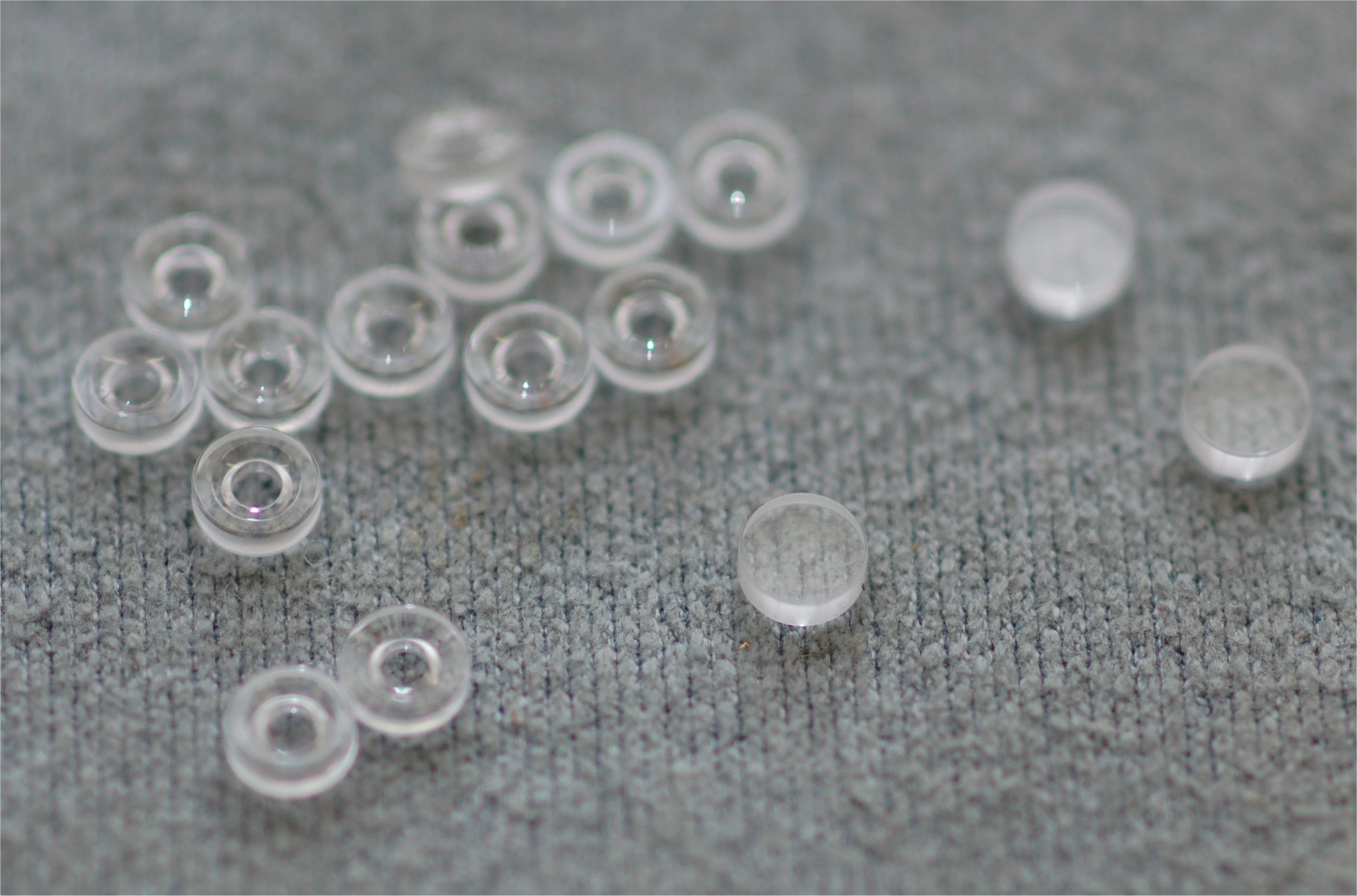 Jewels; A group of synthetic, clear sapphire jewels with oil cups for the pivots, the solid jewels are for the endpieces.